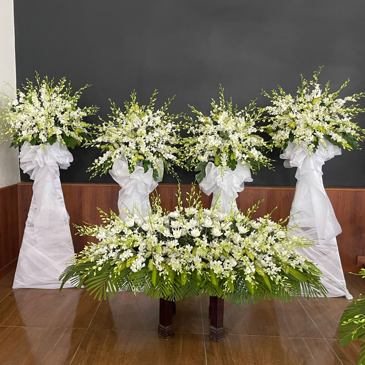 Trong trang trí hoa tang lễ luôn cần phải có hoa tươi. Hoa là biểu tượng cho cái đẹp và trong buổi tang lễ hoa thể hiện sự hy vọng người mất ra đi nhẹ nhàng và thanh thản. Theo quan niệm tâm linh thì hương thơm của hoa tỏa ra sẽ giúp vong hồn người khuất cảm thấy nhẹ nhàng hơn. Trang trí hoa tươi sẽ bao gồm hoa nắp quan tài, 1 bàn vong, 1 bàn phật và 2 trụ hoa