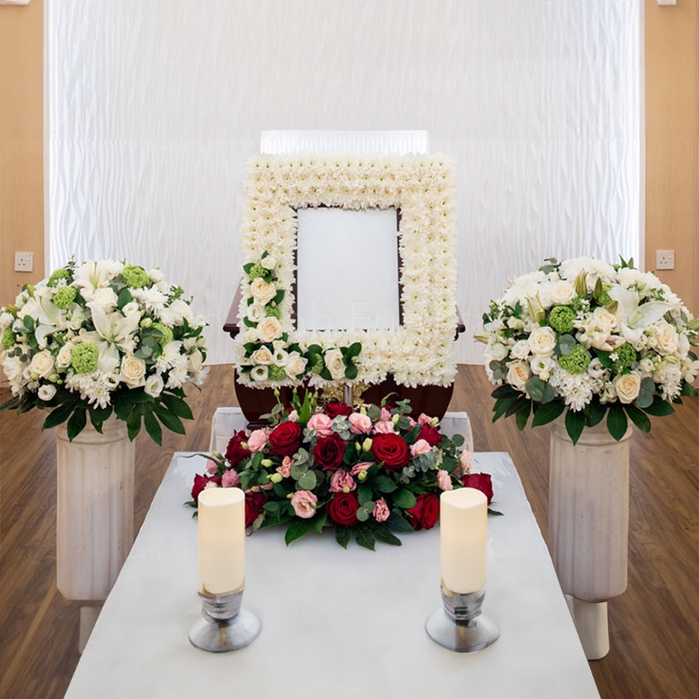 Với gói dịch vụ an táng trọn gói tiêu chuẩn. Sảnh tang sẽ được trang trí theo tang lễ phật giáo hoặc công giáo, tùy vào nhu cầu của gia đình. Các vật phẩm trang trí sảnh tang trong gói an táng trọn gói tiêu chuẩn bao gồm: Bàn phật hoặc bàn thờ chúa, bàn vong, trụ đèn, màn lộng, thùng phúng điếu